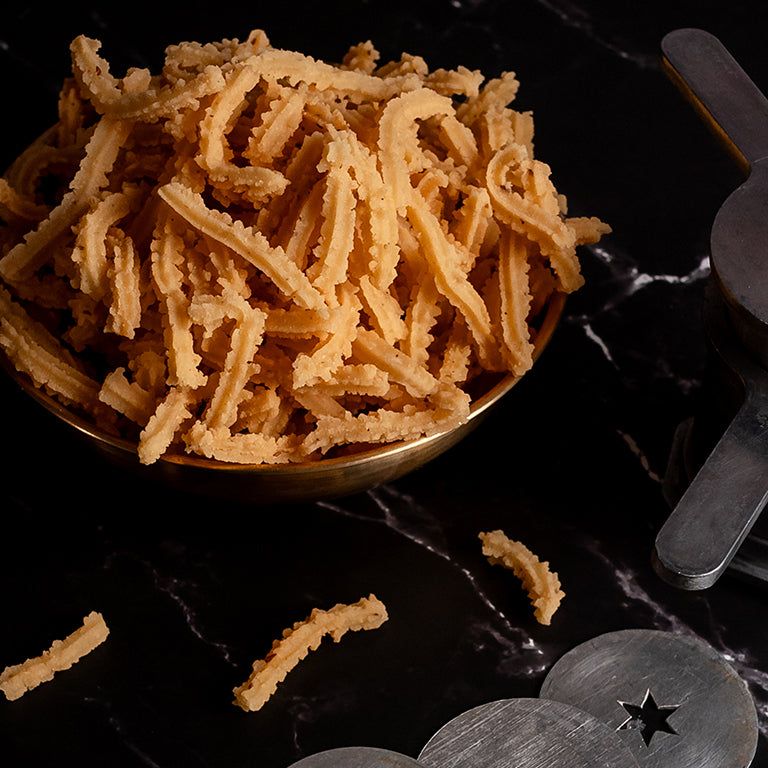| Key Ingredients: | Rice flour, moong dal flour, channa dal flour, butter, cumin seeds, and a dash of asafoetida. |