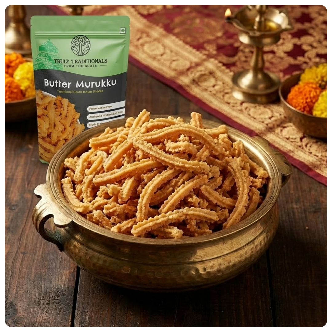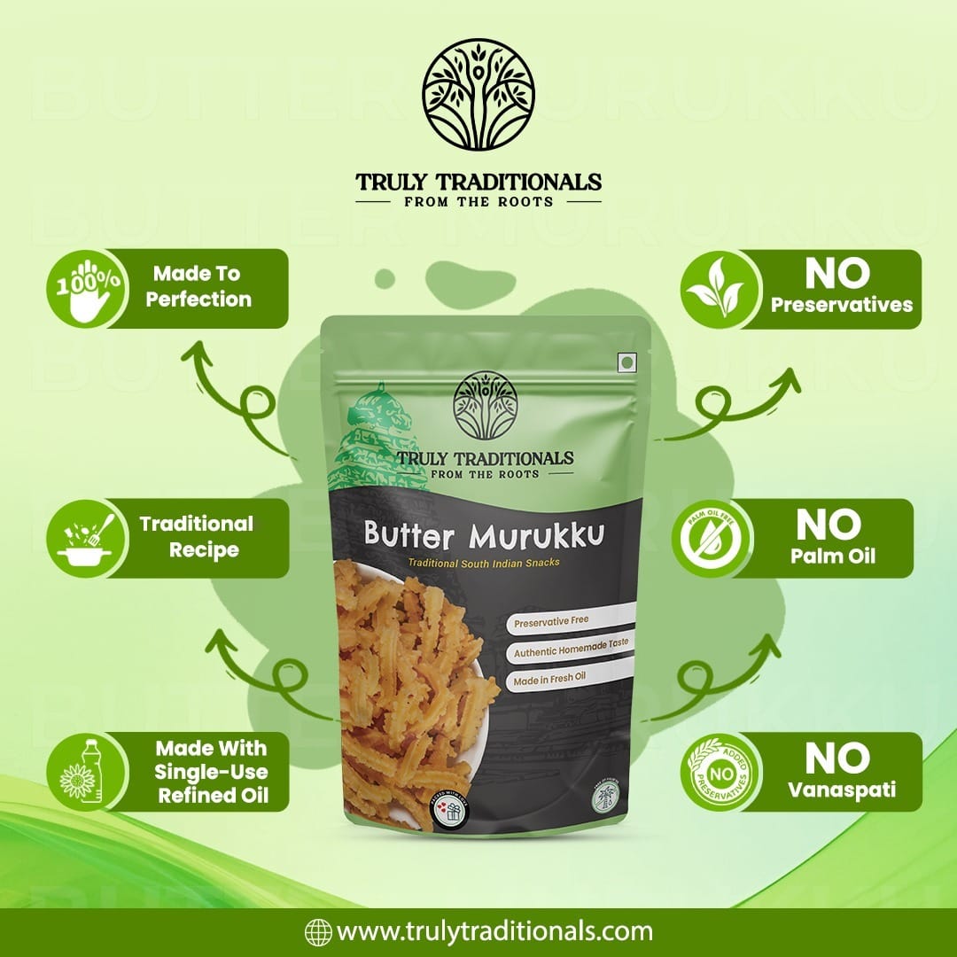 At TrulyTraditionals, we bring you the authentic taste of homemade Butter Murukku. Our snack is crafted with utmost care, using traditional methods and premium quality ingredients. We believe in providing wholesome food, which is why our Butter Murukku is made without any artificial preservatives, colors, or unhealthy palm oil. Indulge in the goodness of our crispy and delicious snack, knowing that you're making a healthy choice.