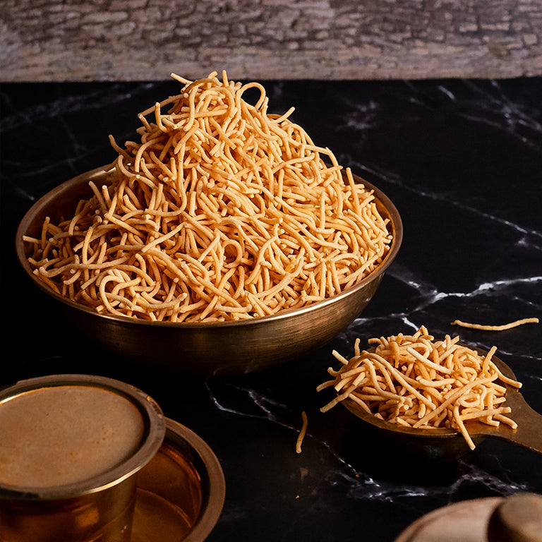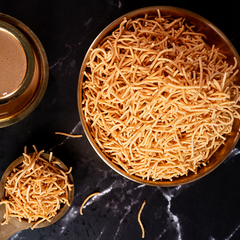Omapodi is a classic South Indian snack renowned for its airy, crunchy texture and distinctive flavour. Crafted from a harmonious blend of besan (gram flour) and rice flour, this delightful treat gets its unique taste from the aromatic ajwain (carom) seeds. Seasoned with a subtle mix of red chilli powder, and turmeric, Omapodi is a versatile snack perfect for enjoying on its own, as a crunchy topping, or alongside a cup of steaming tea or coffee. It’s a staple at festive gatherings and a beloved indulgence for many.