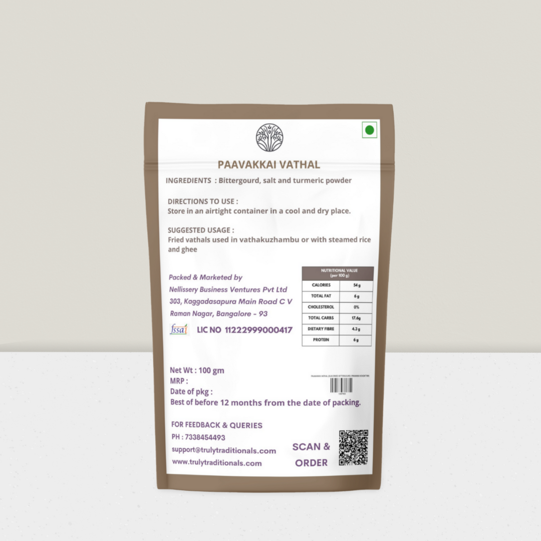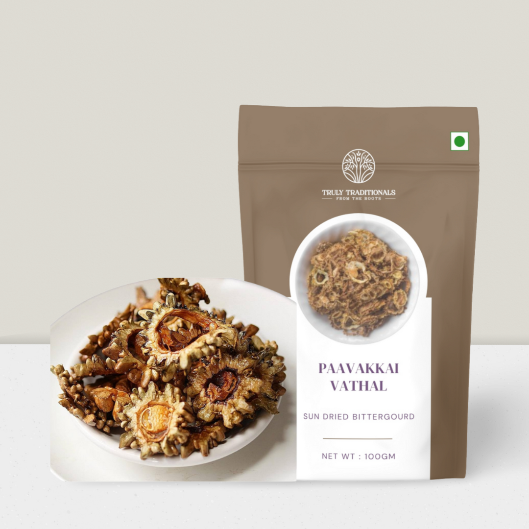 TrulyTraditional's Paavakkai Vathal is crafted using traditional methods to preserve the authentic taste and quality of bitter gourd. Perfectly paired with steaming hot rice or curries, this vathal adds a crispy, bitter twist to your dishes. Our Paavakkai Vathal is made without any artificial preservatives or colors, ensuring a natural and healthy product.