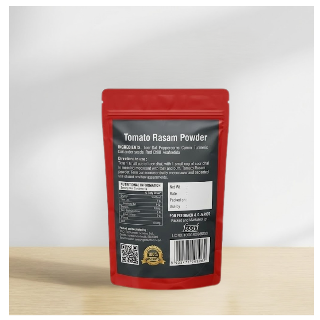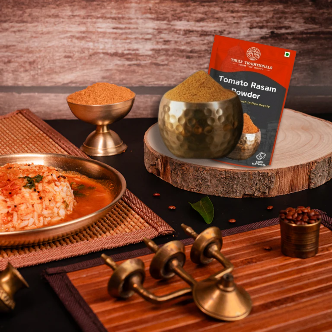 At TrulyTraditionals, we bring you the authentic taste of homemade Tomato Rasam Powder. Our spice blend is meticulously crafted using traditional methods and premium spices. The perfect balance of flavours is achieved through careful roasting and grinding. We believe in the purity of ingredients, which is why our Tomato Rasam Powder is free from artificial additives and preservatives. Experience the difference that our authentic spice blend can make in your cooking.