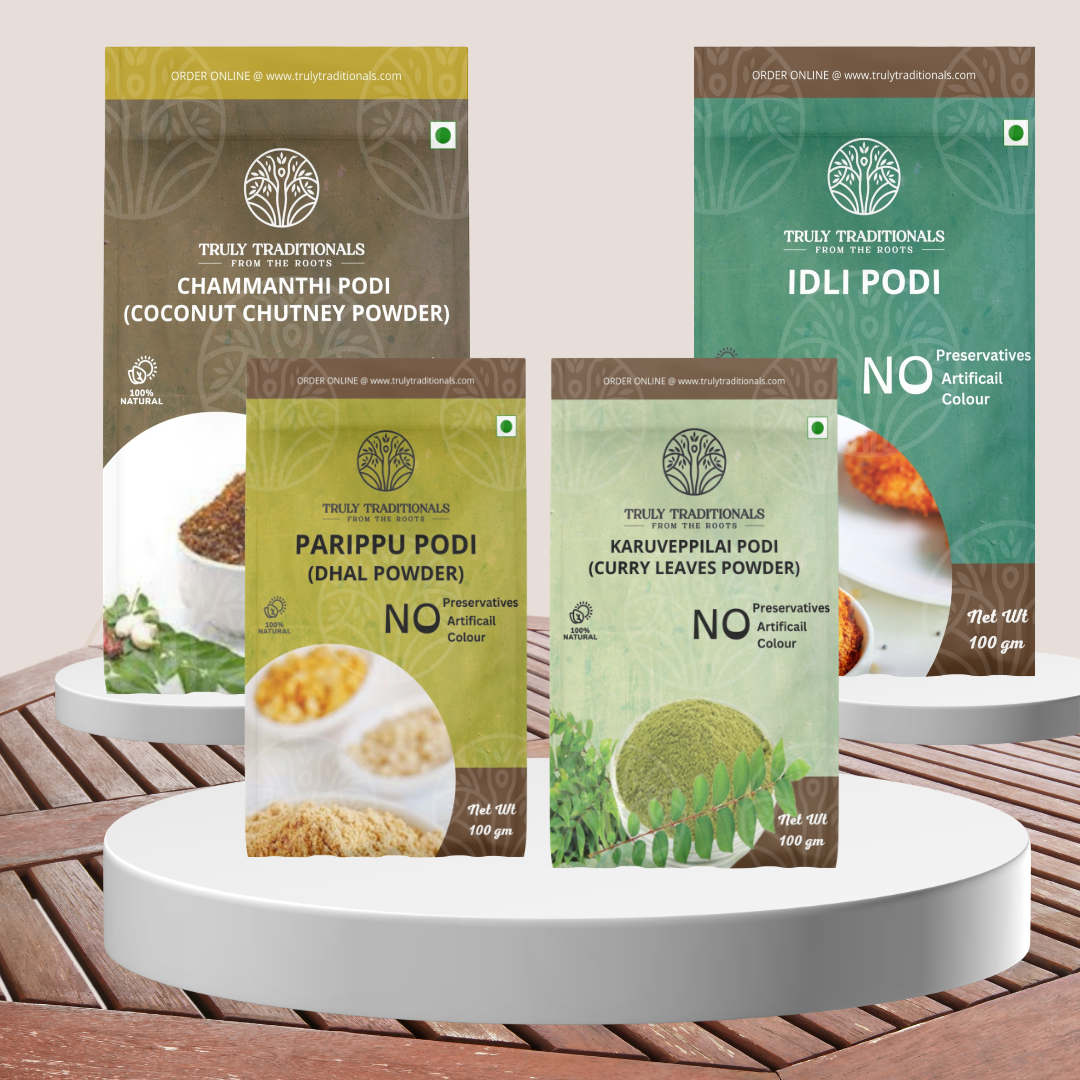 The Rice Mix/Gun Powder Chutney Combo Box is a curated collection of four essential South Indian spice powders: Idli Powder, Chammanthi Podi (Coconut Chutney Powder), Curry Leaves Powder, and Parippu Podi (Dhal Powder). These versatile powders are the foundation for creating a variety of delicious and authentic South Indian dishes. From enhancing the taste of idlis to adding depth to curries, this combo box offers a world of flavour possibilities.