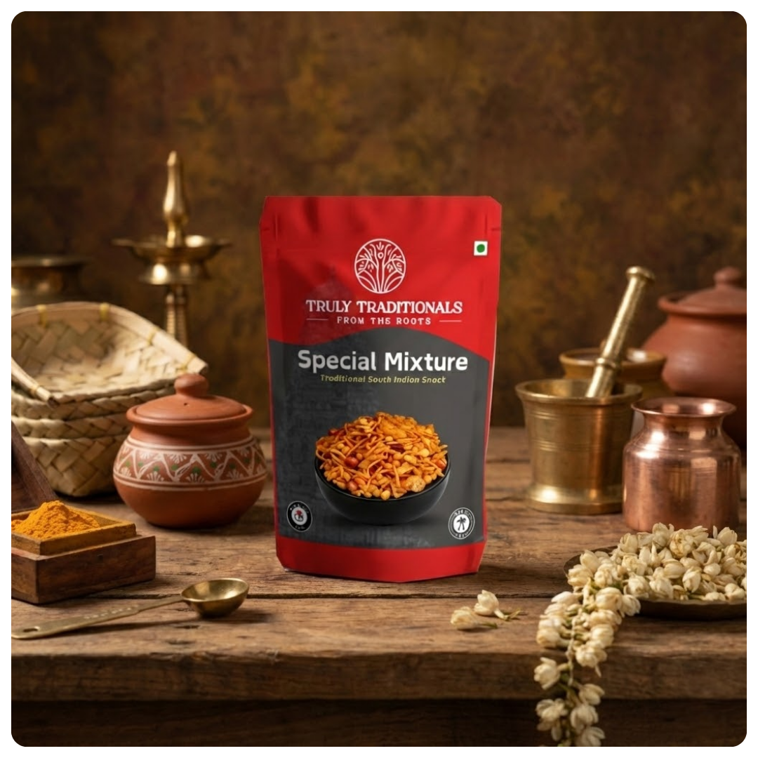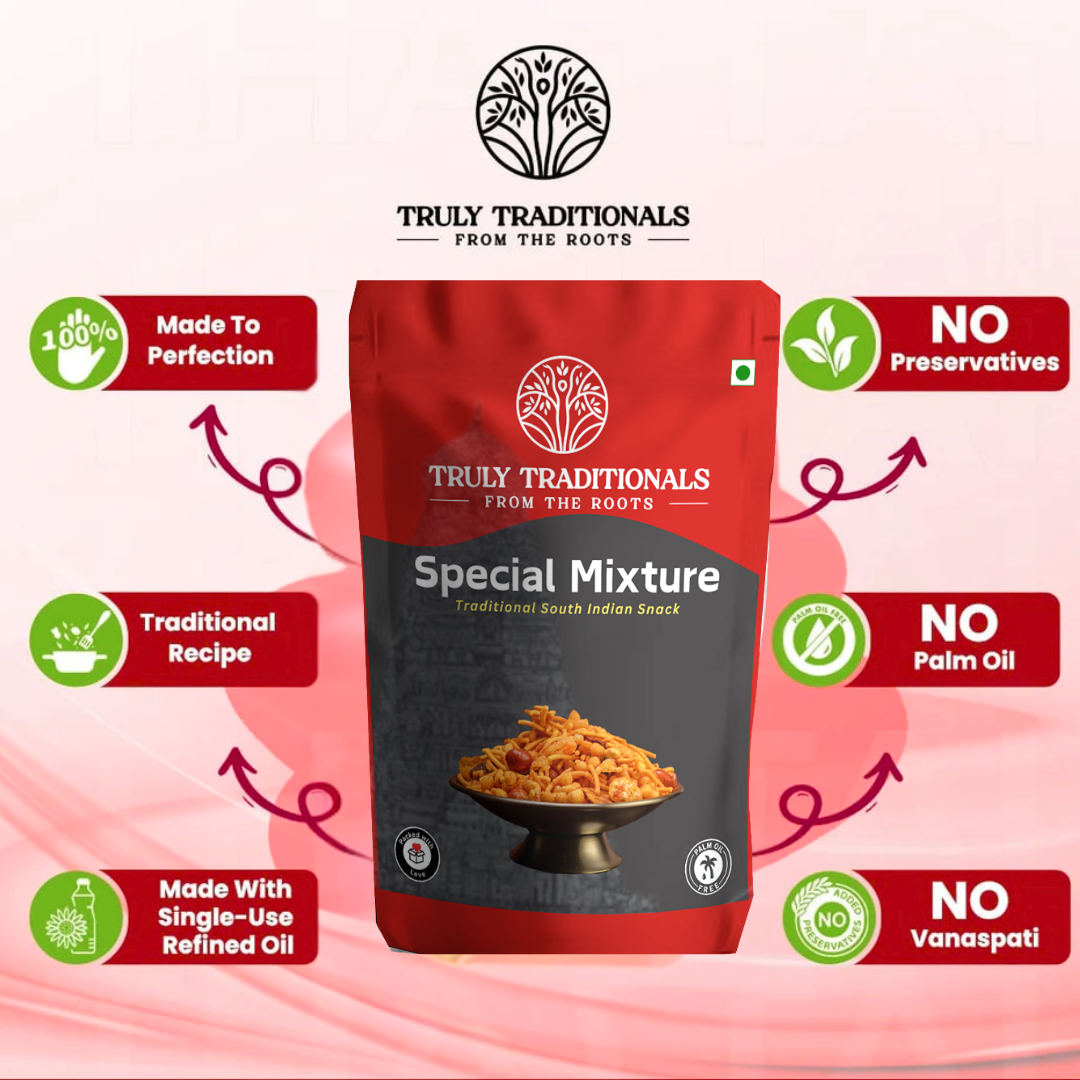At TrulyTraditionals, we bring you the authentic taste of homemade Special Mixture. Our snack is handcrafted with utmost care, using traditional methods and premium ingredients. We believe in the purity of food, which is why our Special Mixture is made without any artificial preservatives or flavors. This ensures a fresh, homemade taste in every bite. The perfect balance of ingredients creates a delightful crunch and a burst of flavors. Enjoy our Special Mixture as a healthy and satisfying snack.