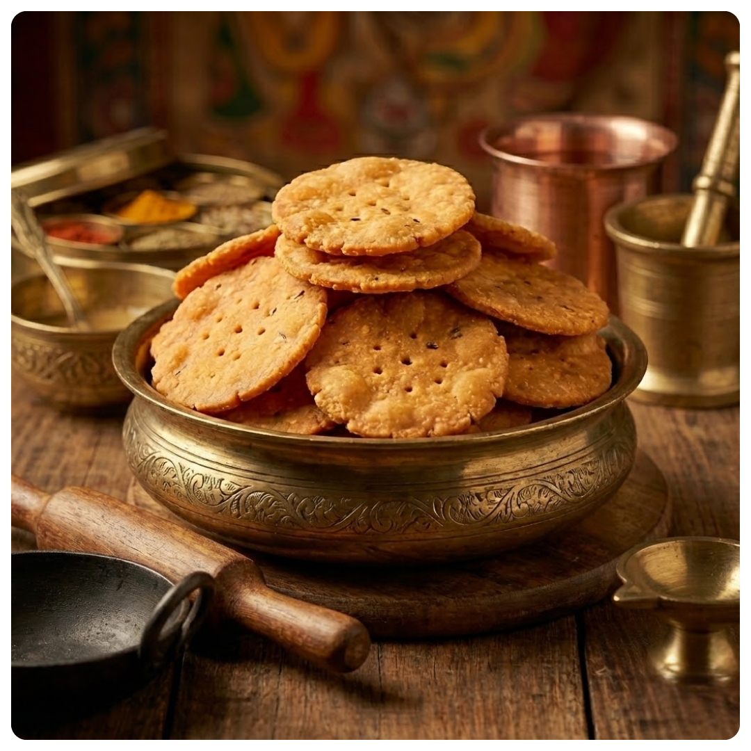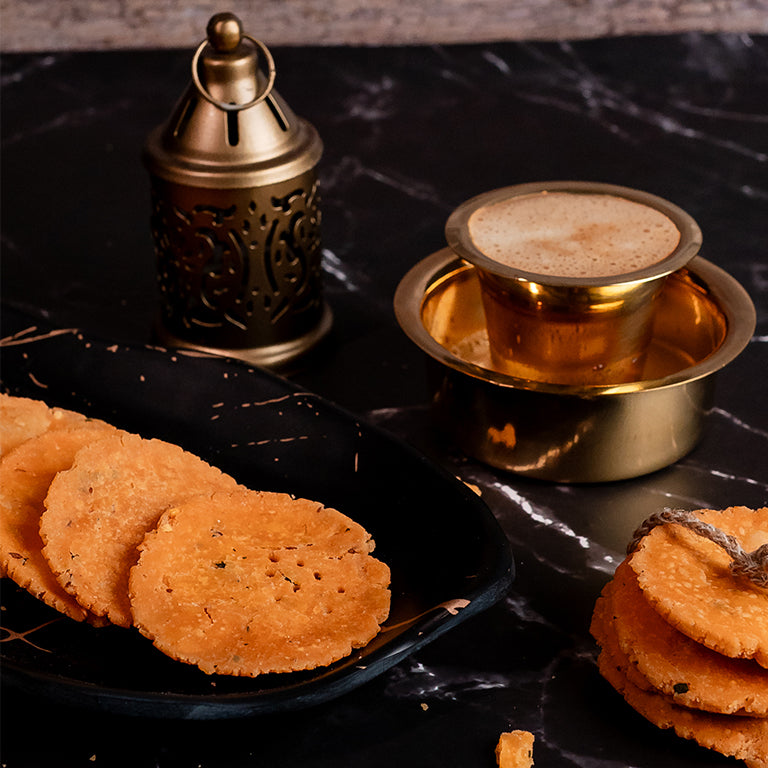 Thattai is a beloved South Indian snack renowned for its delightful crunch and irresistible taste. Traditionally crafted with a blend of rice flour, urad dal flour, chana dal, butter, and sesame seeds, it's a deep-fried delicacy enjoyed for generations. A perfect companion to tea or coffee, Thattai adds a festive flair to celebrations. Its versatility shines as it can be relished alone or paired with chutneys.